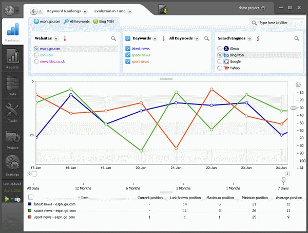 Advanced Web Ranking prend donc en compte le positionnement dans les résultats des moteurs de recherche sélectionnés du site web, mais indiquera aussi la pertinence par rapport aux mots-clés précédemment choisis du contenu du site et la probabilité qu’on le retrouve aisément. En fournissant de telles informations, il devient plus rapide d’optimiser le référencement naturel des sites web.