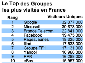 A noter qu’il s’agit d’un classement par « groupe », la cinquième place des Pages Jaunes correspond donc au cumul des audiences du groupe Pages Jaunes, notamment pagesjaunes.fr (7éme audience française) et mappy.fr (24ème).